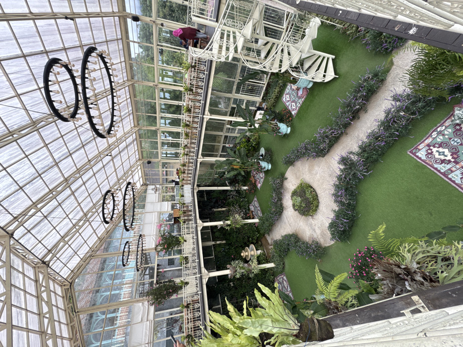 A vibrant greenhouse interior features tiered plant displays and a patterned walkway, dividing manicured green spaces. Overhead, decorative circular light fixtures hang from the glass ceiling, which is supported by a white metal frame. A spiral staircase stands prominently amidst the foliage. Vintage rugs are placed intermittently. Plants and flowers add color to the scene.