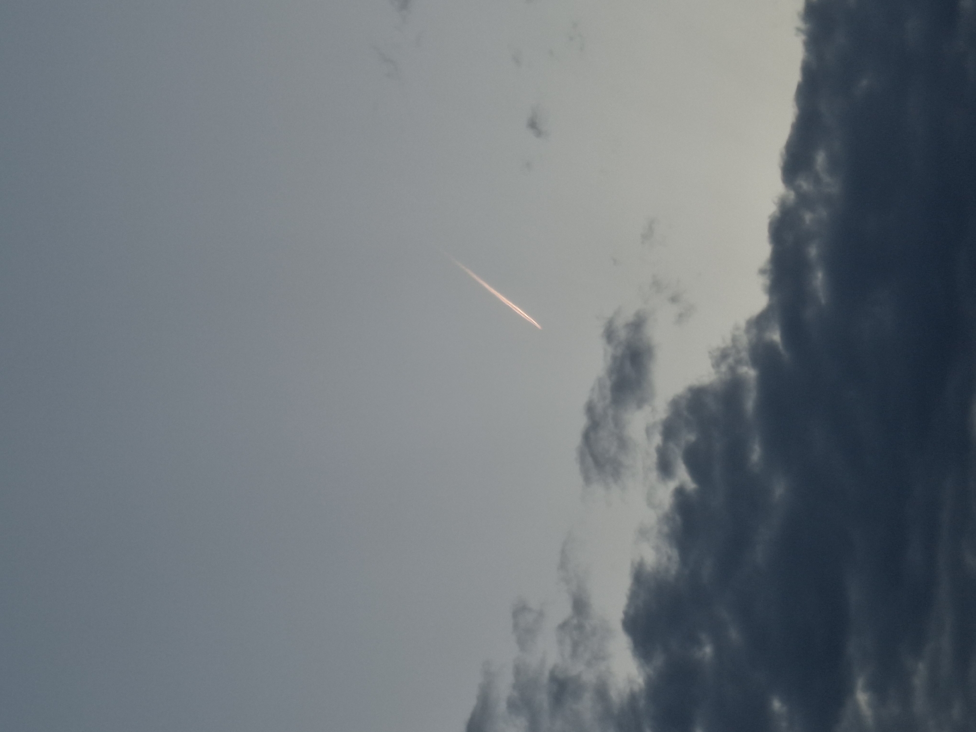 The image depicts a cloudy sky with a contrail diagonally crossing the frame from the upper left to the lower right. Dense, dark clouds are clustered on the right side of the frame, contrasting with the lighter gray sky on the left. The contrail appears as a thin, orange-tinted line. The location is not discernible as Chaikovsky, Russia from this image alone.