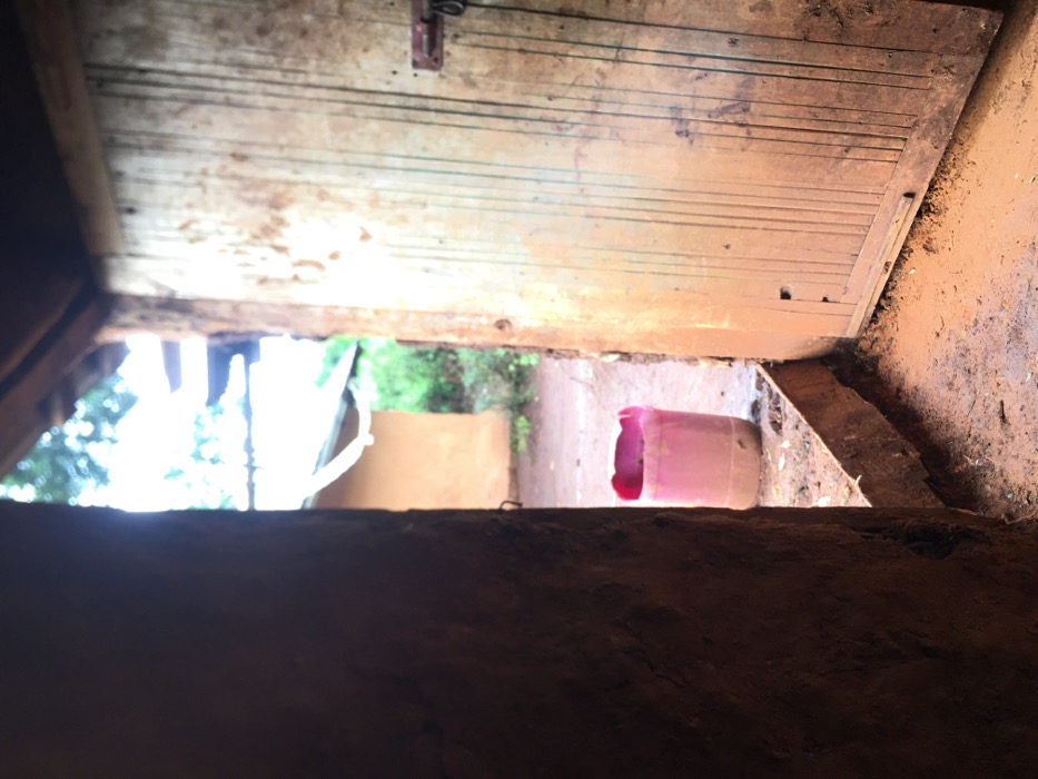 From a dark, low vantage point, a dim view reveals a dilapidated wooden structure. A worn plank door with horizontal grooves forms the top of the frame. Outside, a narrow pathway leads past a light-colored wall and lush greenery. A bright, indistinct object rests near the path. A pink, tattered container sits precariously on the ground below the door frame. The rough, earthen walls enclose the dark space.