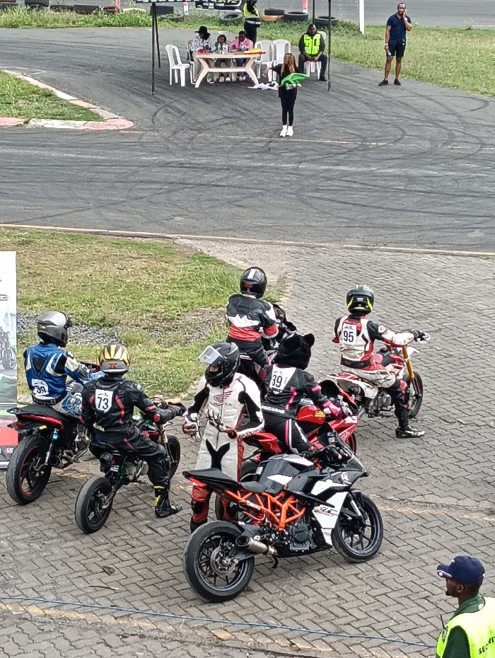 The image depicts an outdoor motorsport environment in Matathani ward, Kenya, featuring a paved track area and an adjacent asphalt racing surface. In the foreground, on an interlocking paver surface, five individuals in full motorcycle racing gear are positioned with their motorcycles. From left to right: 1. A rider in a blue and white suit with number 39 is seated on a black sportbike. 2. A rider in a black and red suit with number 73 and a gold/black helmet is seated on a smaller red/black pit bike. 3. A rider in a white and red suit with an open-visor helmet stands beside a black and orange KTM RC-series sportbike. 4. A rider in a black and pink suit with cat-ear helmet features and number 39 is seated on a red sportbike. 5. A rider in a white and red suit with number 95 is seated on a red and white dirt bike or supermoto. In the mid-ground, a dark asphalt track displays numerous tire and skid marks. To the right of the track, a grassy area is visible. In the background, under a white pop-up canopy, a group of individuals is present. At a white table, four people are seated; one is in a dark top, and three appear to be children or smaller adults with casual attire. A pink object is on the table. A woman in black clothing and white sneakers stands next to the table, holding a green flag or banner. To her right, a man in a yellow/green high-visibility vest is seated at the table. Further to the right and slightly behind the canopy, a man in a dark polo shirt and shorts stands observing. In the bottom right foreground, a man in a blue cap and a yellow/green high-visibility vest is partially visible, facing towards the motorcycles. Stacked tires, possibly serving as barriers, are visible in the far background.
