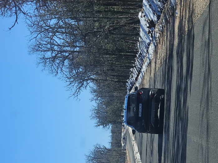 The scene depicts a paved asphalt road in the city of Ait Naamane, Morocco, under a clear, bright blue sky. A dark-colored Hyundai Tucson SUV is observed from its rear, positioned on the right side of the road and traveling away from the viewer. The vehicle displays a Moroccan license plate reading "14159 | 20". The asphalt road surface is dark, with long shadows cast across it from the right. The road is bordered by a forest on both sides, primarily composed of deciduous trees with bare branches, indicating a winter setting. Dense patches of snow are visible along the right shoulder and ditch of the road, contrasting with areas of dark earth and sparse brown foliage. Further along the road on the left, white barriers or curbs are present. A small white object, possibly a piece of debris, is discernible on the right shoulder near the snow. No individuals or specific human actions are visible in the image.