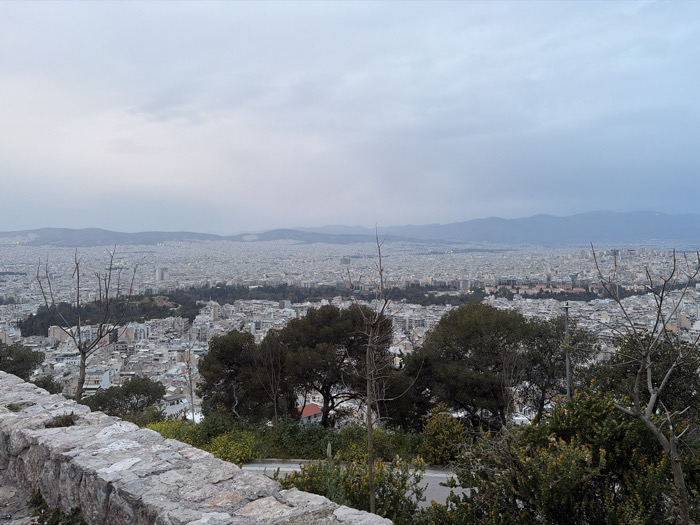 The image displays an elevated panoramic view of the city of Athens, Greece, under an overcast sky. In the foreground, a rough-hewn stone wall, composed of light grey and tan blocks, extends diagonally from the lower left towards the mid-right. Behind and immediately to the right of the wall, a slope is covered with dense vegetation including dark green evergreen trees, lighter green bushes, patches of yellow flowering plants, and several leafless deciduous trees with thin branches. A section of a dark grey paved road is partially visible amidst the foliage. The midground is dominated by a vast expanse of urban development, featuring countless light-colored buildings tightly packed across the terrain. Several smaller, dark green forested areas are interspersed within the city grid. The distant background reveals hazy, bluish-grey mountain ranges along the horizon. The sky is uniformly covered with light grey to bluish-grey clouds, indicating a cloudy condition or twilight. No people or specific actions are discernible within the frame.