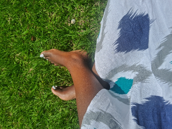 The image depicts a close-up, high-angle view of a person's bare lower legs and feet resting on green grass in Muthambi ward, Kenya. The person's skin tone is dark brown, and the feet are crossed at the ankles, with both visible. Toenails on both feet are painted a solid white. The person is wearing a garment over their lap and upper legs, featuring an abstract pattern of large, textured shapes in dark blue, teal, and gray against a white background. The grass beneath the feet is vibrant green and appears well-lit by natural sunlight, indicating an outdoor setting. No other individuals or objects are discernible.