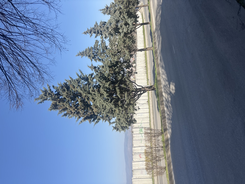 The image displays an outdoor daytime scene in Blagoevgrad, Bulgaria, under a clear, cloudless blue sky. In the foreground, a multi-lane asphalt road is visible, marked by distinct shadows cast by trees to the right. A narrow, grassy median strip separates the road from an elevated area. This median features a cluster of low, bare-branched bushes to the left. Lining the elevated area is a row of approximately five tall, slender coniferous trees, characterized by dark green foliage, which cast prominent shadows onto the road. Behind these trees, a long, segmented concrete barrier wall extends horizontally across the mid-ground, displaying patches of graffiti in red and green. In the upper right quadrant of the frame, bare branches of a deciduous tree are visible against the sky. The distant background reveals a range of low-lying hills or mountains under the bright, direct sunlight. No individuals or vehicles are present in the scene.