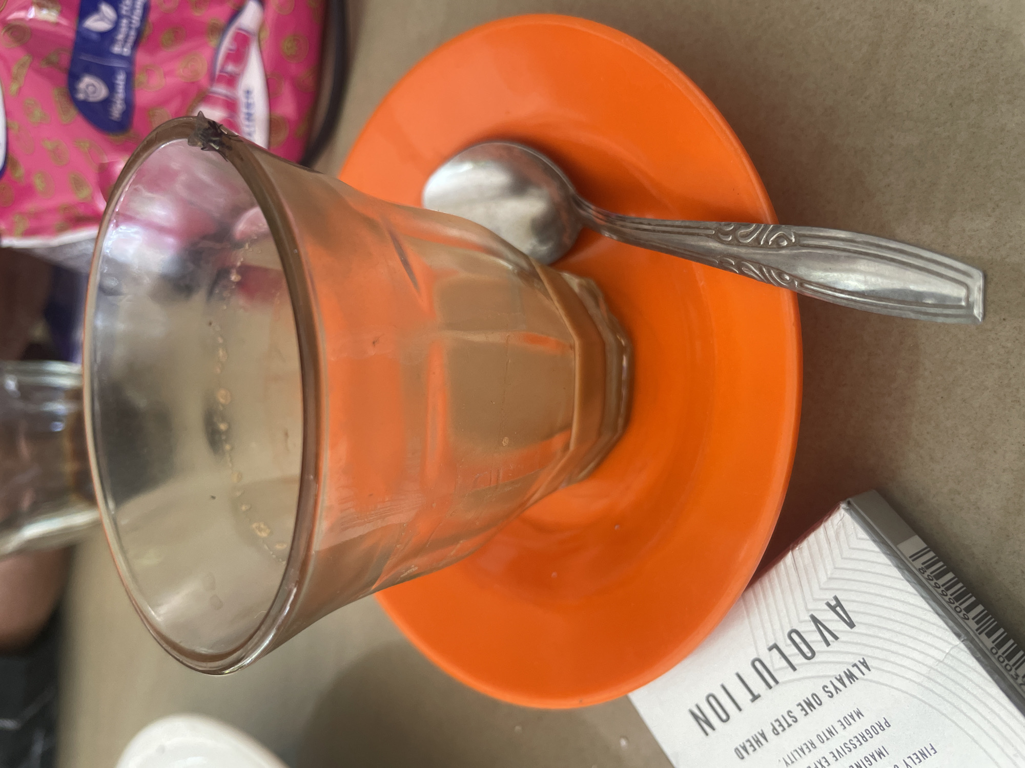 The image presents a close-up view of a tabletop scene located in Lhokseumawe, Indonesia. In the central foreground, a clear, tapered glass tumbler stands on a bright orange circular saucer. The glass contains a small quantity of light brown liquid residue coating its interior, indicative of a beverage that has been mostly consumed. A small, dark-colored fly is visible resting on the upper right exterior rim of the glass. A silver-colored spoon with an engraved handle lies on the orange saucer, positioned to the right of the glass. Partially visible in the lower left, beneath the saucer's edge, is a white and grey cigarette pack labeled "AVOLUTION," with additional text "ALWAYS ONE STEP AHEAD" and a partial barcode. The surface of the table is light brown and appears smooth. In the blurred background, a white ceramic plate is visible on the far left, and a pink plastic package or bag with graphics is discernible on the right. A blurred segment of a human arm or shoulder is faintly visible in the upper left background.
