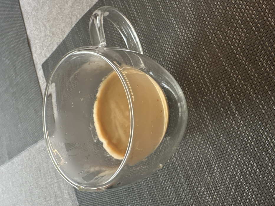 - "A clear double-walled glass mug, containing a light brown liquid with a thin layer of lighter-colored crema on its surface, rests on a dark grey woven placemat" by FM-WIzQ23, licensed under CC BY 4.0