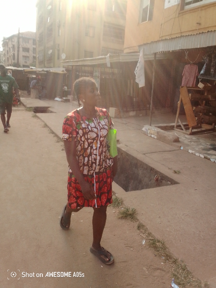 A woman in a patterned dress and sandals walks on a sunlit street. Buildings are visible in the background with makeshift shops lining the street. A man in a green shirt walks in the opposite direction. Sunlight reflects off the buildings, causing glare. A green bag hangs off the woman's shoulder. The street has open gutters.