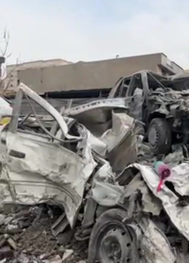 aftermath of an explosion or destructive event, with multiple cars piled on top of each other amidst debris