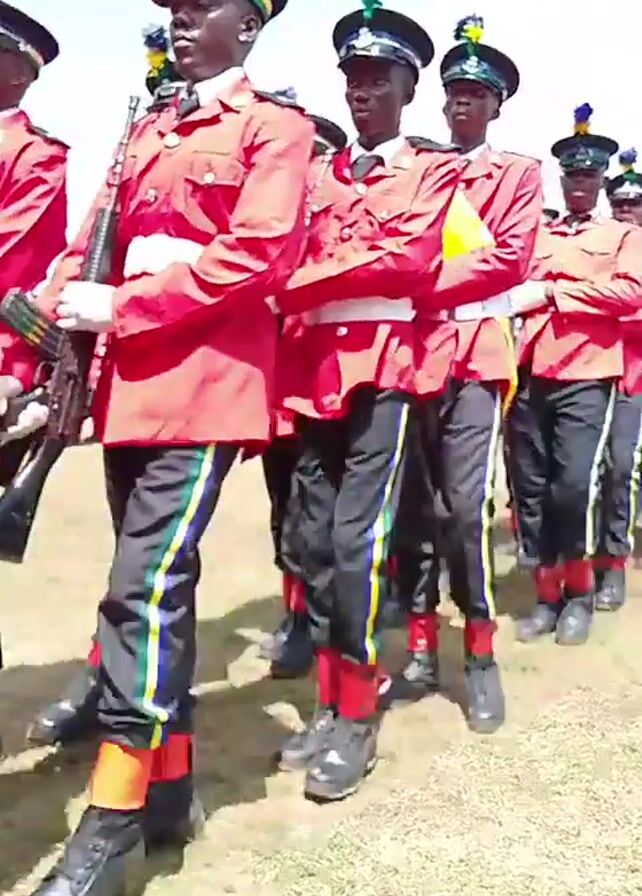 A line of uniformed individuals march in formation on a grassy field. They wear red coats with white trim, black trousers with colored stripes (blue, yellow, green), black shoes and hats with decorative plumes. Some carry rifles. The sky is partly cloudy.