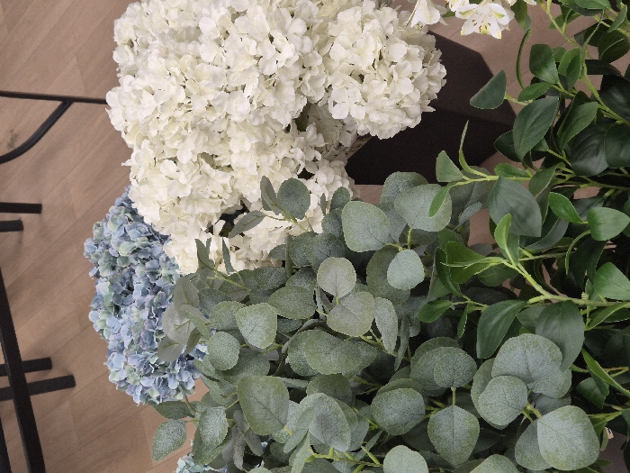 The scene depicts a static, indoor arrangement of artificial foliage and floral displays. The image's content provides no identifiable features of Corinth, Greece; the setting is an unidentifiable indoor space. The foreground is dominated by a dense arrangement of green plant material. On the left, a cluster of light green, ovate leaves, characteristic of eucalyptus, is prominently displayed. To its right and below, darker green, glossy foliage with smaller, pointed leaves on visible stems is present. In the midground, positioned behind the green foliage, are two large, spherical clusters of flowers, each in an unidentifiable dark container. The cluster on the left is composed of numerous small, light-blue or grayish-blue petals, consistent with hydrangeas. To its right, a larger, fuller cluster of white hydrangea-like flowers is visible. A small portion of white flowers with yellow centers is partially visible in the bottom right corner. The background features light-brown flooring, possibly wood or laminate, and segments of dark, slender metal furniture legs are present in the upper left quadrant. No individuals are present, and no actions or interactions are depicted within the frame.