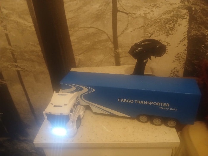 The scene depicts a white toy tractor truck with illuminated headlights, hitched to a blue toy semi-trailer