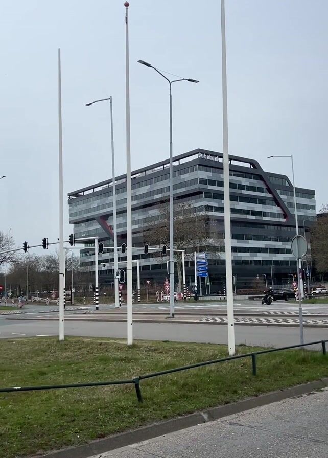 wide shot of a modern, multi-story building with a glass facade in an urban environment. The building prominently displays the name "Rabobank" on its upper section. A large intersection is in the foreground, with multiple crosswalks and traffic lights. Several white poles stand upright on the grassy median separating the street. The sky is overcast, suggesting a cloudy day. A person on a motor scooter crosses the street, and a few cars are visible in the background. The overall scene appears to be a typical weekday at a business complex.