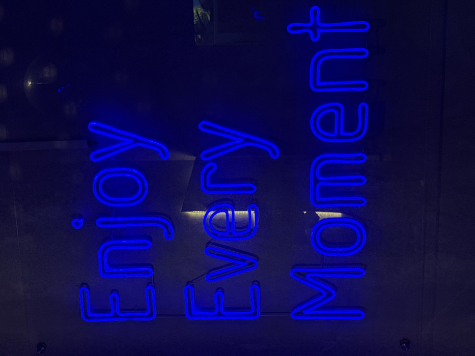 - "A blue neon sign displaying the phrase "Enjoy Every Moment" is mounted vertically on a dark, non-reflective wall in Rumassala, Sri Lanka" by FM-PAcZC3, licensed under CC BY 4.0