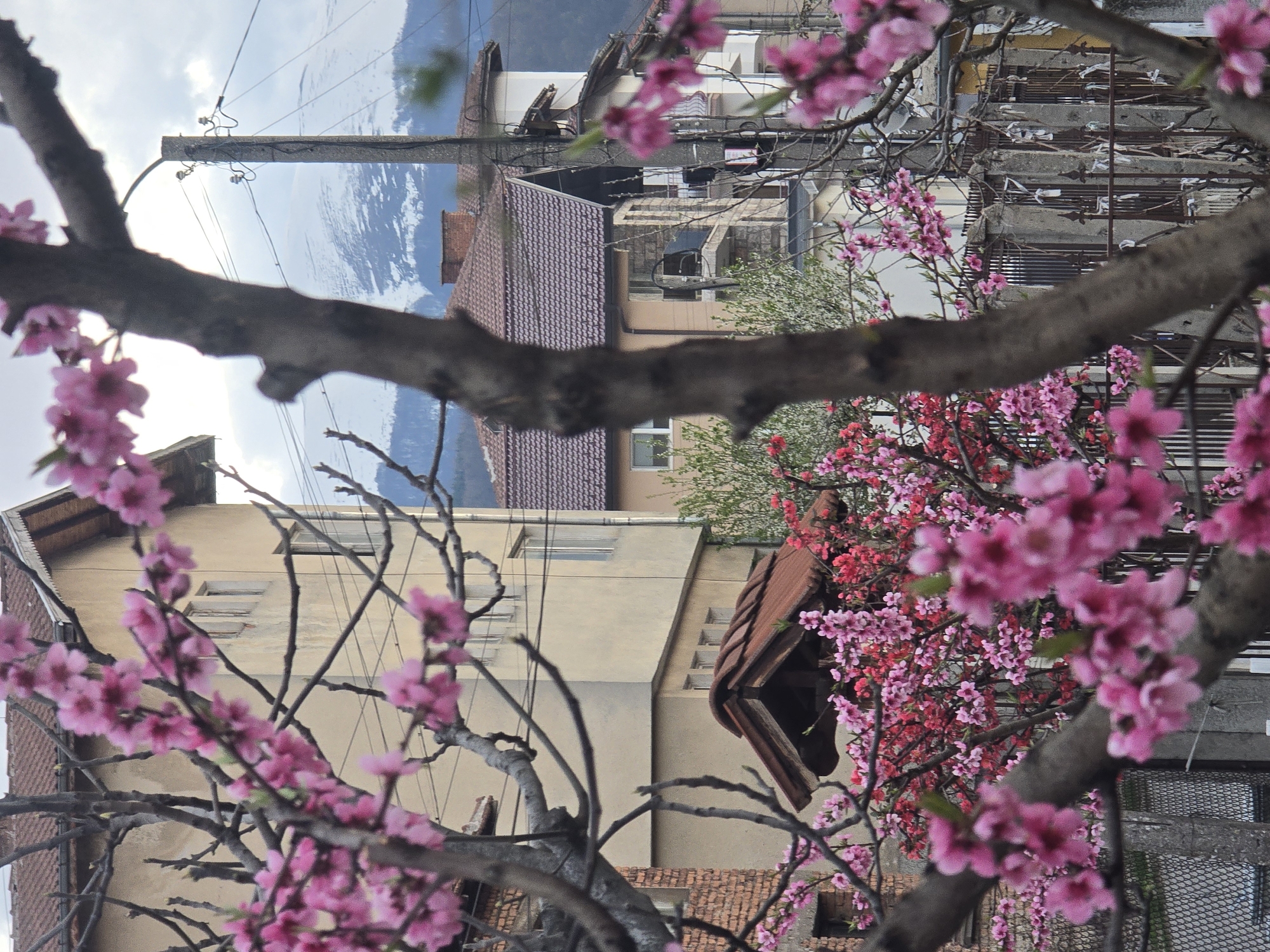 street scene in Berkovitsa, Bulgaria, with buildings partially obscured by flowering trees. Predominantly pink and red blossoms fill the foreground. Several buildings are visible, featuring terracotta roofs and light-colored facades. A utility pole appears in the background between two buildings, with mountains visible behind them. The sky is partly cloudy.