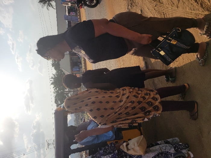 Three people stand near a three-wheeled vehicle, likely a tuk-tuk, with fabric displayed on it. The person closest to the camera wears a patterned top and brown pants, while another wears a simple black dress. An adult woman in a black shirt and brown pants holds a black purse. All three wear sandals. The scene appears to be an outdoor market or roadside vendor setting during daytime. The sky is visible with some clouds.
