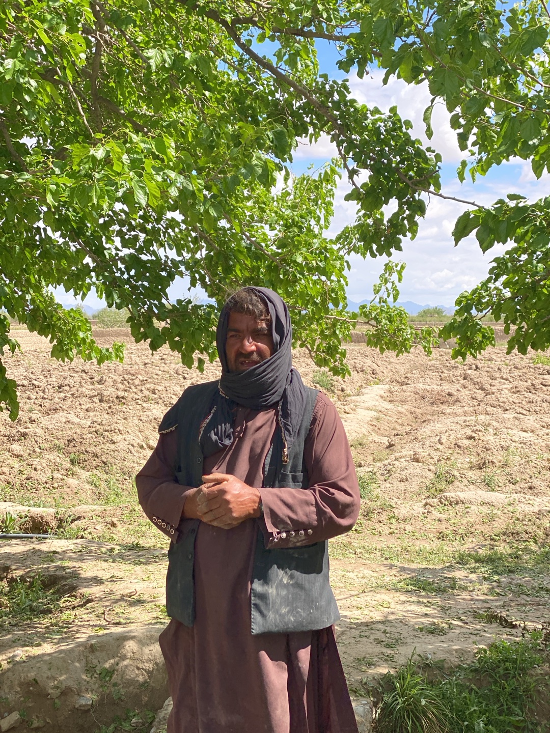 In the city of Qazi Kariz, Afghanistan, a man stands outdoors under a tree with dense green foliage