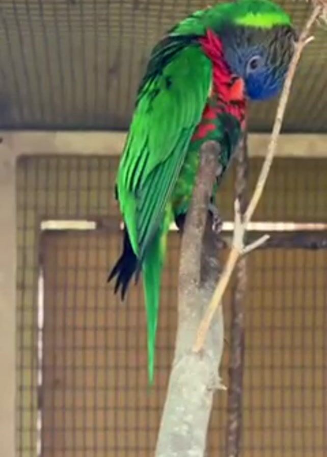 In an indoor enclosure, a colorful parrot perches on a branch. The bird has predominantly green plumage, with red and blue markings on its head and chest. It rests on the branch, its head slightly bowed. The cage, constructed from a wire mesh, is visible in the background.