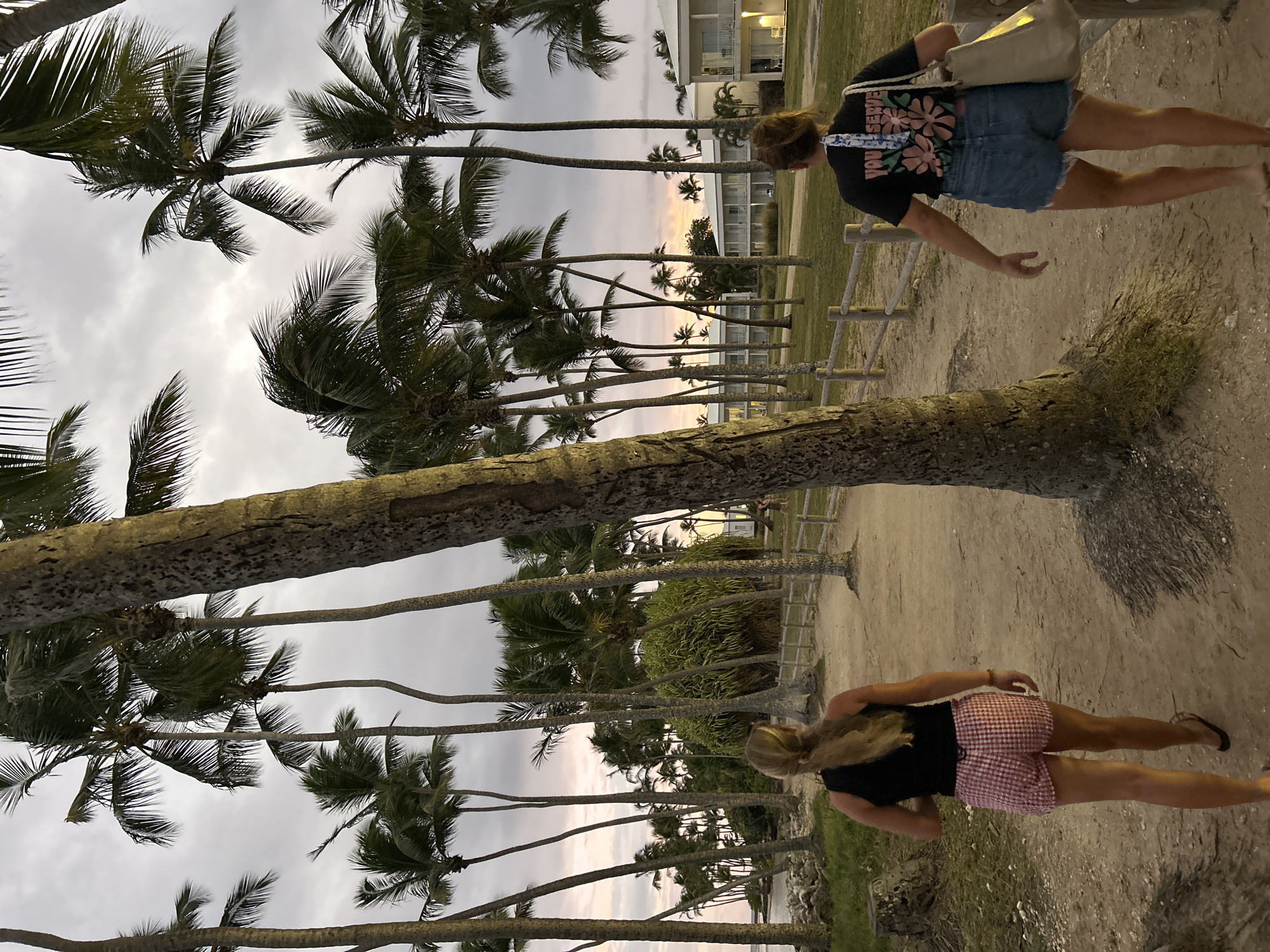 The scene depicts a sandy path lined with palm trees under a cloudy sky, presumably near dusk or dawn. Two women are walking along the path. The first woman, positioned on the right side of the image, is wearing a black t-shirt with floral designs, blue denim shorts, and carrying a light-colored shoulder bag. The second woman, on the left side of the image, is wearing a black top and red and white checkered shorts. The environment suggests a tropical location. In the background, a building is visible, indicating proximity to civilization. The specific location within Sainte-Anne, France, cannot be ascertained without further visual context or landmarks. The overall impression is that of a casual stroll along a beachside path.