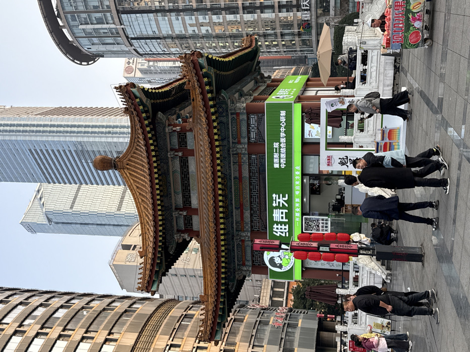 The image presents an urban landscape centered on the Jiefangbei Pedestrian Street in Yuzhong District, Chongqing, China. A prominent two-story traditional Chinese pavilion with an ornate, multi-tiered terracotta-tiled roof, dark red and green decorative eaves, and a central finial dominates the midground. The ground floor of this pavilion operates as a commercial establishment, fronted by a bright green sign. The sign displays "维声芜" (Wéi Shēng Wú), identifying the primary business, along with "重庆医附院 中西医结合医学中心研制" (Chongqing Medical Affiliated Hospital, Integrated Traditional Chinese and Western Medicine Center Developed) and "一杯茶会到哪 喝出东方养生" (A cup of tea will arrive, drink Eastern health), accompanied by a QR code. The pavilion is situated amidst a backdrop of numerous modern glass-clad skyscrapers, reflecting a dense, contemporary urban environment. A tall, curved building with visible windows stands to the left, and a cylindrical glass tower is partially visible to the right. The foreground consists of a paved pedestrian plaza where approximately fifteen individuals are observed. People are walking in various directions; a man in a black shirt and jeans is on the left, while several men in business attire, including one in a dark suit, traverse the central area. A street vendor operates a white cart on the right, displaying freshly cut fruit such as watermelon and pitaya, marked by a "现切水果" (Freshly Cut Fruit) sign. Two individuals are seated under a beige umbrella at a small table near the pavilion. A black pole adorned with vertically stacked red lanterns stands in the mid-foreground. White stone balustrades surround the raised platform of the pavilion. The scene is illuminated by clear daylight, indicating late morning or early afternoon.