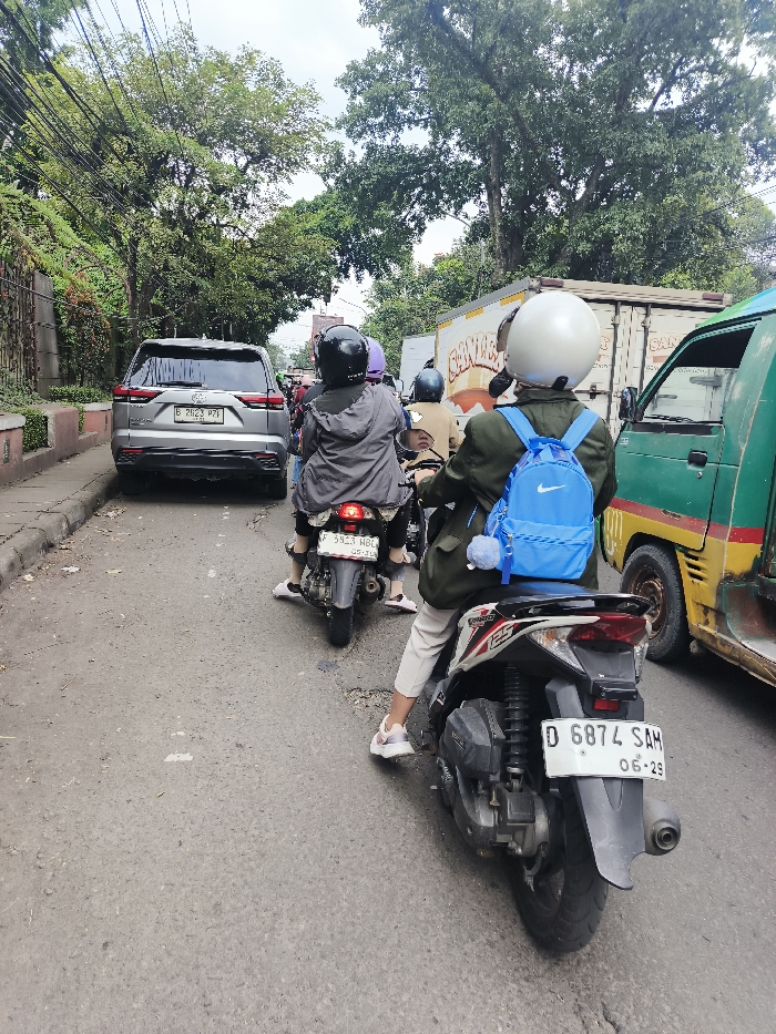 A daytime, eye-level photograph captures a congested traffic scene on an asphalt road in Cimahi, Indonesia
