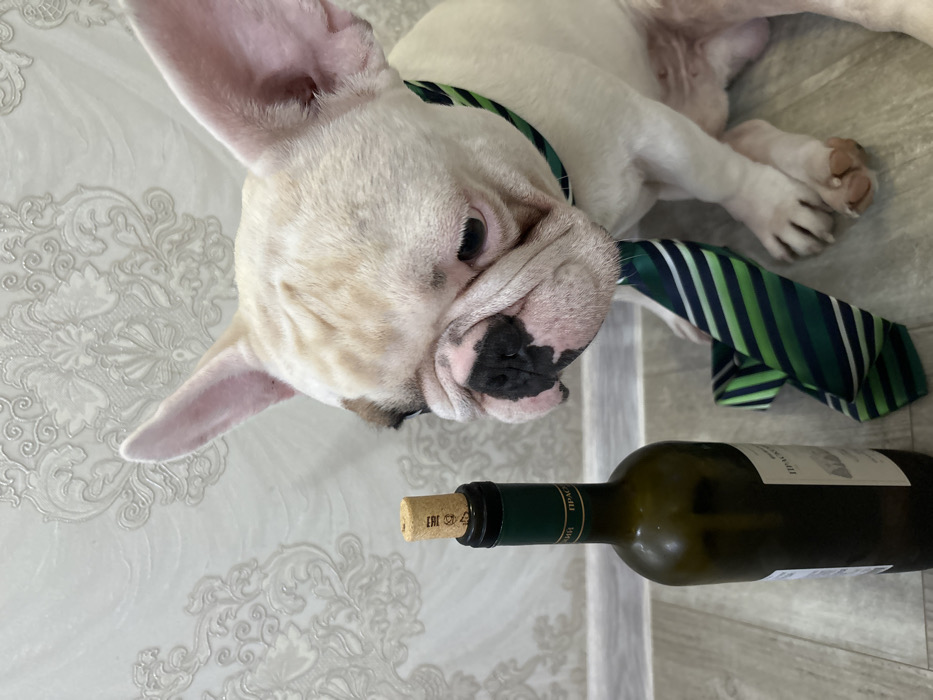 - "An indoor scene in Chaikovsky, Russia, depicts a cream and white French Bulldog seated on a light-colored wooden or laminate floor, positioned to the right of a dark green wine bottle" by FM-DSCl32, licensed under CC BY 4.0