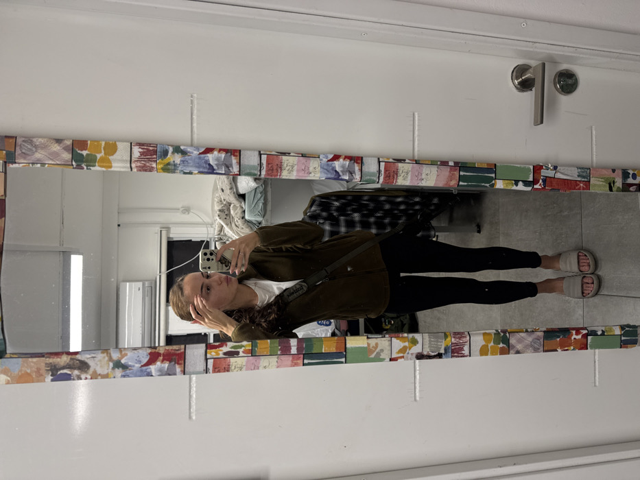 A reflection shows a woman in black leggings, a white shirt, and a green jacket with a dark crossbody bag