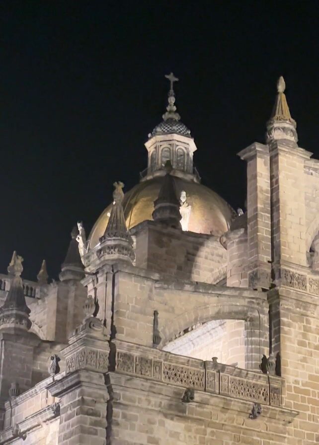 The camera looks up at a church at night. It is illuminated by lighting that makes the building appear to be a pale tan. People are standing along the edge of the building. A crowd of people is visible in the foreground, and some are holding up their phones to take pictures. In the background, the sky is dark.
