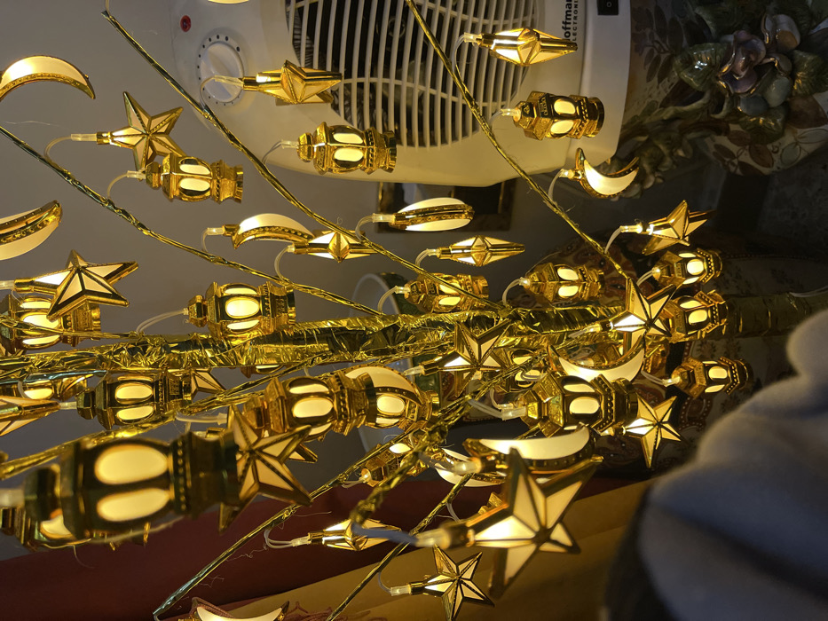 Gold, star, and lantern-shaped lights intertwine, reflecting on a glossy surface. Above, a white space heater dominates, with a glimpse of floral decor on the right. The lighting fixture's arrangement creates a complex, layered composition. The scene evokes a festive, possibly holiday-themed, atmosphere with a warm, golden glow. A blurry, soft grey shape occupies the lower right corner.