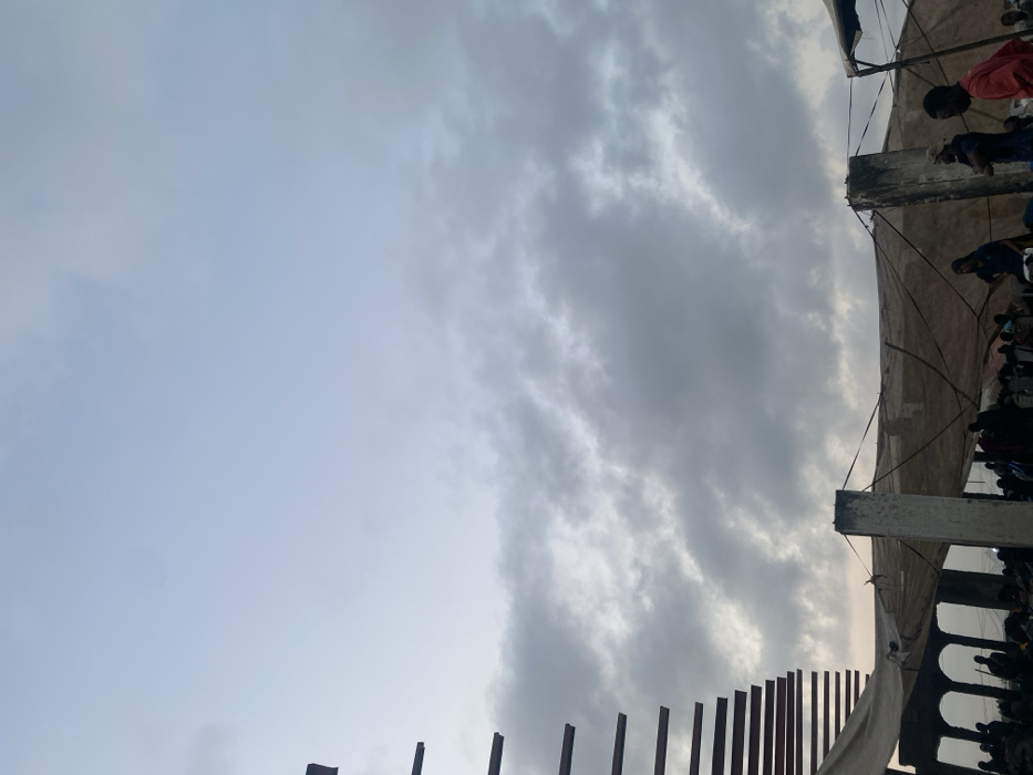 A cloudy sky fills most of the frame. Below, dark vertical lines suggest a fence or structure. To the right, figures appear under a makeshift shelter, possibly a market stall. The perspective is angled upwards, emphasizing the sky.