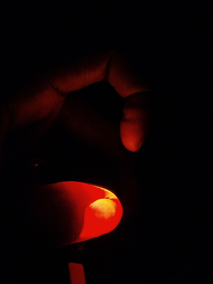 The scene, located in Keffi, Nigeria, depicts a dark environment illuminated by a localized red-orange glow. A single, oval-shaped object, consistent with a fertilized avian egg, occupies the lower-left portion of the frame, emitting a bright red-orange light from within, indicating an internal light source. A distinct yellow-orange patch on the egg's surface suggests internal structures are visible through the shell. Above the egg, partial views of human fingers are present. A thumb is visible in the upper-left, and another finger, likely an index finger, is positioned in the upper-right, with its tip glowing faintly red. These fingers appear to be either holding or examining the egg. The background is entirely black, suggesting the absence of ambient light, consistent with the process of candling an egg. A dark, rectangular shape is partially visible along the bottom edge of the image.