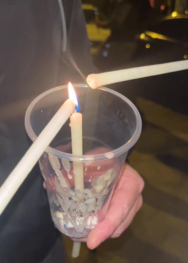 person holding a clear plastic cup with a lit white candle inside. The cup appears to contain a small amount of water and has melted wax adhered to the inside. Another person is using the flame of the central candle to light two more white candles. The person holding the cup is wearing a dark gray or black jacket. The background is dark, with blurry figures and cars visible.