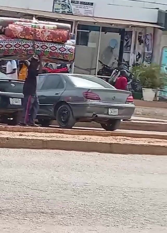 A man carries a tall stack of rolled mats on his head as he walks along a street in front of a row of shops. He is wearing a dark-colored shirt and blue pants with a pink stripe down the side. Two cars are parked on the side of the road next to a low curb. Another man in a red shirt walks by in the opposite direction. A man wearing a green shirt is sitting on a motorcycle in the foreground watching the scene. The background includes the storefronts of several shops, one of which says "Infinix". The street appears to be paved, and the weather is bright and sunny.