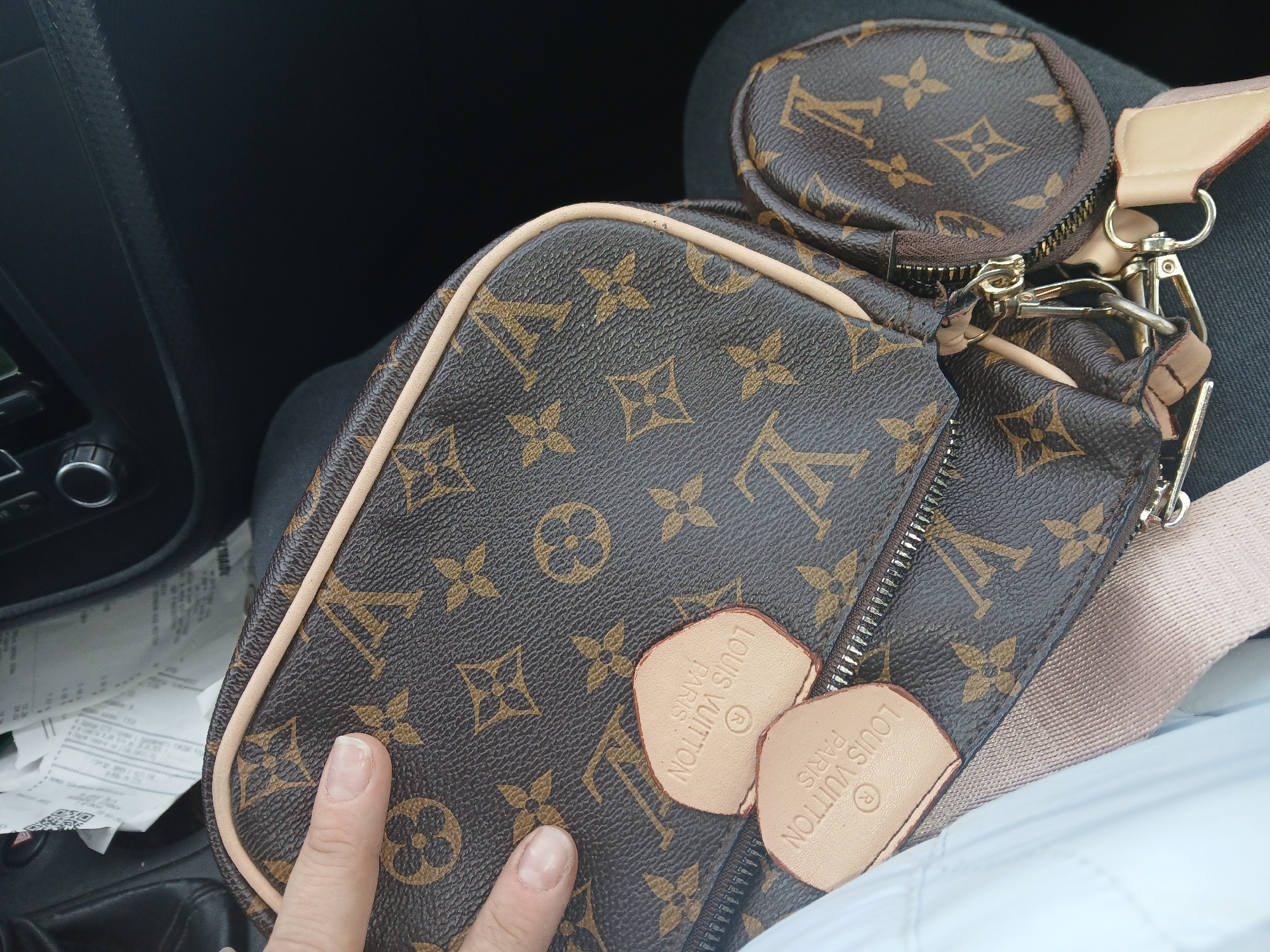 Louis Vuitton Multi Pochette Accessoires handbag placed on what appears to be the seat of a car. A person's hand touches the bag. A car dashboard is visible in the background with receipts or papers also visible in the car's center console area. The location is not possible to determine based solely on the visual information.