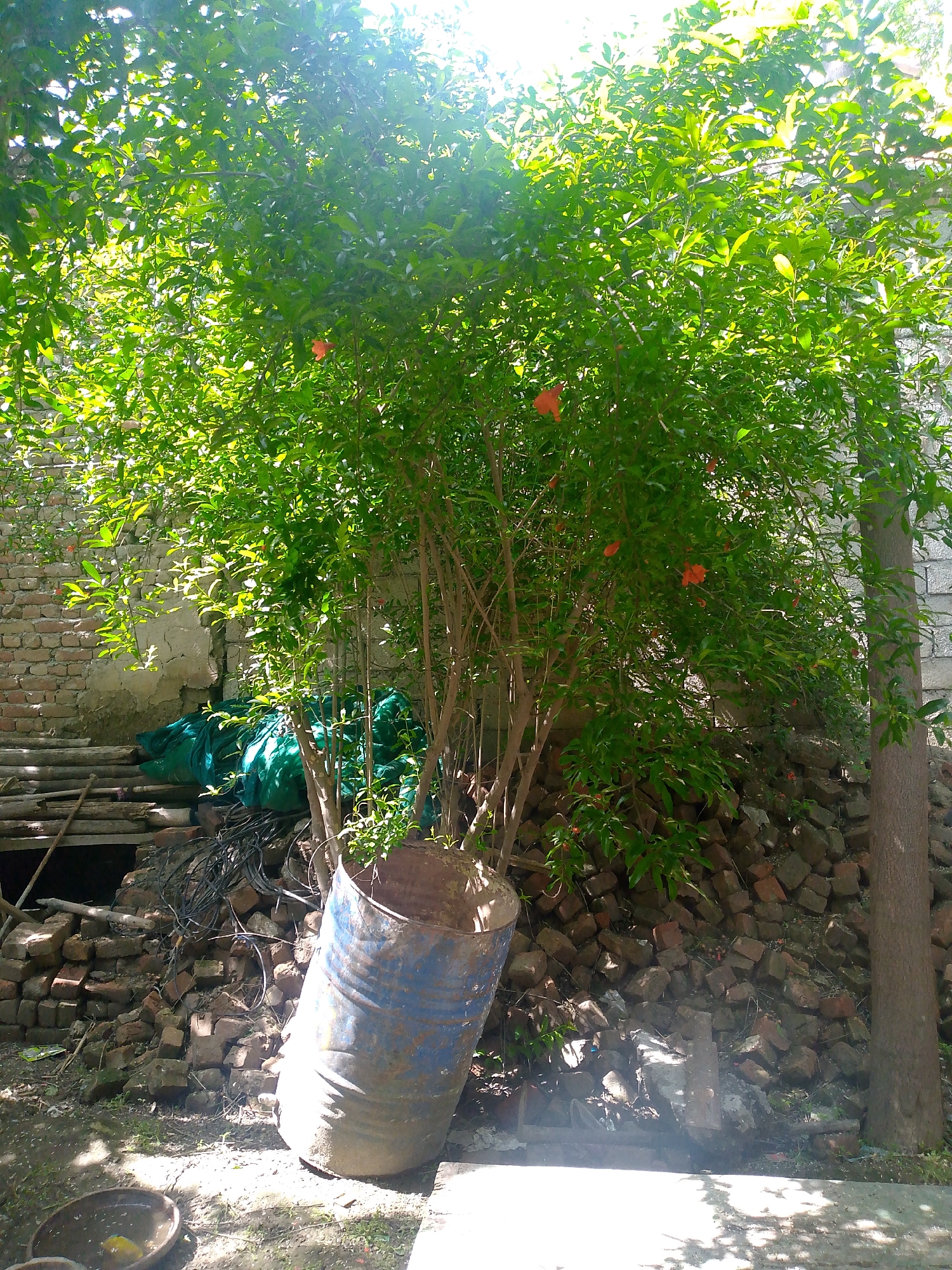 The image depicts a tree growing inside a blue, rusted metal drum, situated in an outdoor setting. The tree has lush green foliage with scattered red blossoms. The drum is leaning against a mound of bricks and debris. Behind the tree, there is a partially visible brick wall and a pile of miscellaneous items covered by a green tarp. The ground is uneven, with patches of grass and exposed earth. A wooden structure is visible near the brick wall. The lighting suggests a sunny day, with bright highlights and shadows throughout the scene.