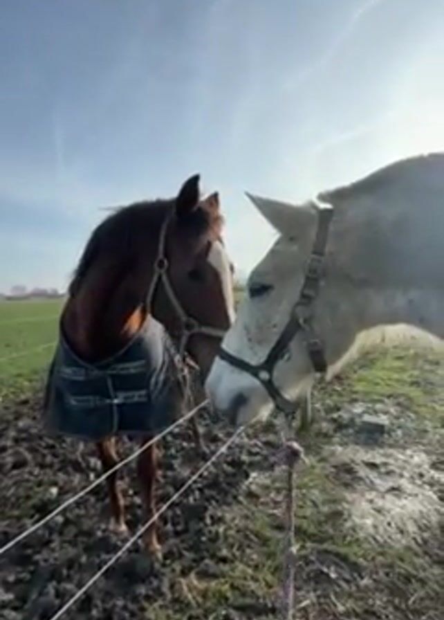 - "Two equines, a horse and a mule, stand in a muddy paddock separated by a thin white electric fence" by FM-xTDQG2, licensed under CC BY 4.0