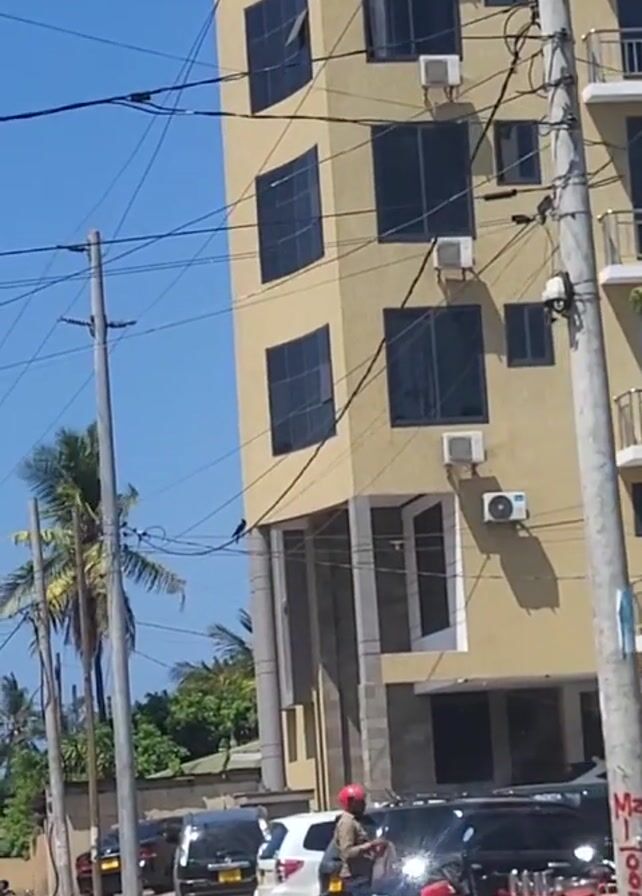 The camera pans from a tall, light-yellow building with dark windows to a street lined with parked cars and utility poles with many wires