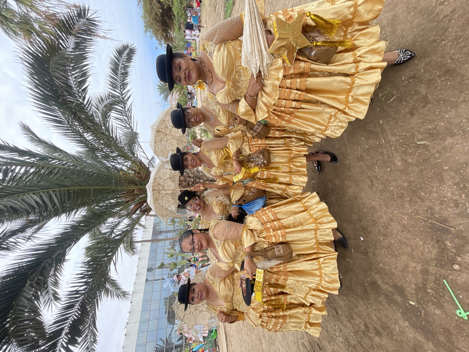 Five women in golden traditional dresses and black bowler hats stand in a line, posing