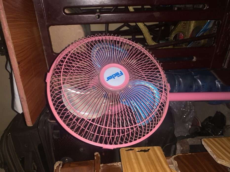 A pink "Fadar" brand fan dominates the frame. Its blades are blue and partially visible through the wire cage. The fan sits amongst various items, including what appear to be wooden boards, a suitcase, and a dark-colored cabinet or shelf unit. The lighting is dim, creating shadows and obscuring details of the surroundings.