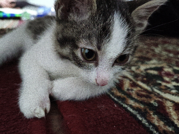 A kitten rests on a patterned rug. It has white fur on its paws and chest, and gray fur on its head and back. A white stripe runs down its forehead. The kitten's eyes are brown and focused downwards. Its pink nose is close to the rug. The rug has a complex pattern of dark and light colors, and there is a red patch beneath the kitten. The overall image has a grainy quality.