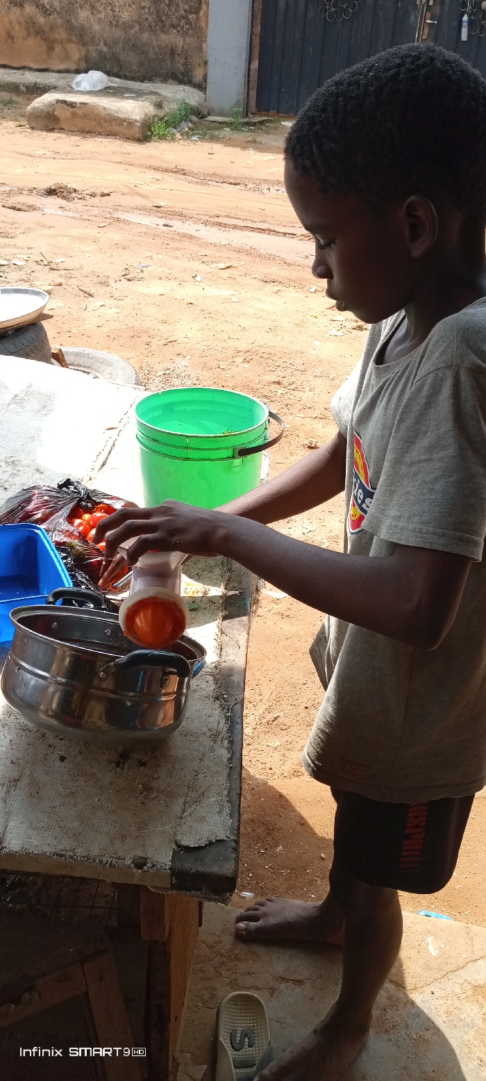A young individual, appearing male, with dark skin and short, curly hair, stands barefoot on reddish-brown dirt ground, engaged in food preparation