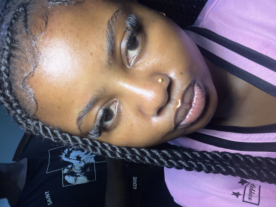 The image displays two individuals in an indoor setting in Asipa, Nigeria. In the foreground, a female with a dark complexion is prominently featured, looking directly towards the camera. She has long, dark twisted braids with styled baby hairs framing her face. Her eyes are adorned with long, prominent false eyelashes, and her eyebrows are defined. A small, spherical gold stud is present in her right nostril, and her lips appear glossy. She wears a light pink garment, which appears to be a track jacket or robe, featuring black vertical stripes on the front and white star motifs with the word "Athletics" visible on the left chest area. In the blurred background, partially visible behind the foreground subject, is another individual wearing a black t-shirt. The t-shirt has white text "SAINT" across the upper visible portion, a graphic design below it depicting multiple classical-style figures, and the word "LOVE" printed near the bottom left edge of the visible fabric. The overall environment is dimly lit, indicative of an interior space.