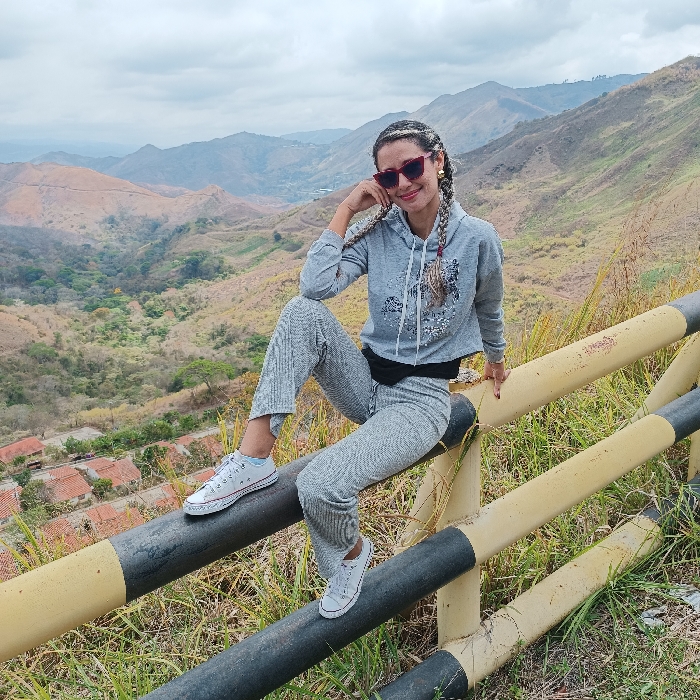 A female individual is seated on a yellow and black striped metal barrier located on a grassy embankment in Sabaneta, Venezuela. She faces forward, wearing red cat-eye sunglasses, a grey hooded sweatshirt with a visible embroidered motif, grey textured pants, and white low-top sneakers. Her hair is styled in multiple braids, and her fingernails are painted red. Her right hand is positioned near her temple. The background reveals a vast, undulating mountainous terrain characterized by dry, light brown and green vegetation, extending under a cloudy sky. A residential area with red-tiled roofs is discernible in the valley below.