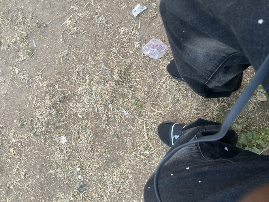 The image presents a ground-level, first-person perspective of an individual's lower body and the surrounding environment in Lokoja, Nigeria. The subject's legs are visible in the lower half of the frame, clad in dark-wash denim jeans exhibiting subtle white speckles. On their feet are black slide sandals, each featuring a white band with a light blue stripe and a distinct logo. A dark blue cord or strap runs diagonally across the lower center of the image. The ground consists of dry, light brown soil interspersed with sparse, desiccated grass blades and small patches of green weeds. Scattered across the ground are various items of refuse, including a translucent plastic bag containing numerous small, reddish-purple objects, located to the right of the subject's right leg. Other debris visible includes fragments of white paper, assorted plastic pieces, and dry organic material.