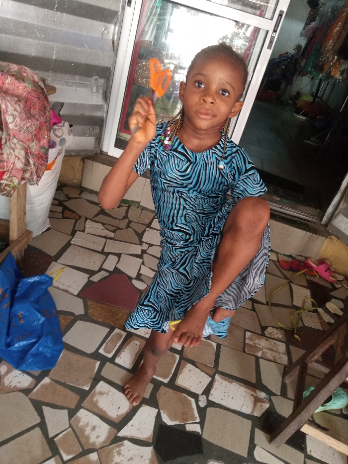 A young girl, estimated to be between 4 and 7 years old, stands barefoot on an irregularly tiled floor in Obosi, Nigeria