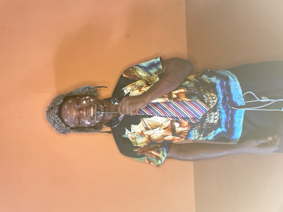 A male individual with dark complexion is positioned centrally against a solid orange wall in Mosafejaw, Nigeria