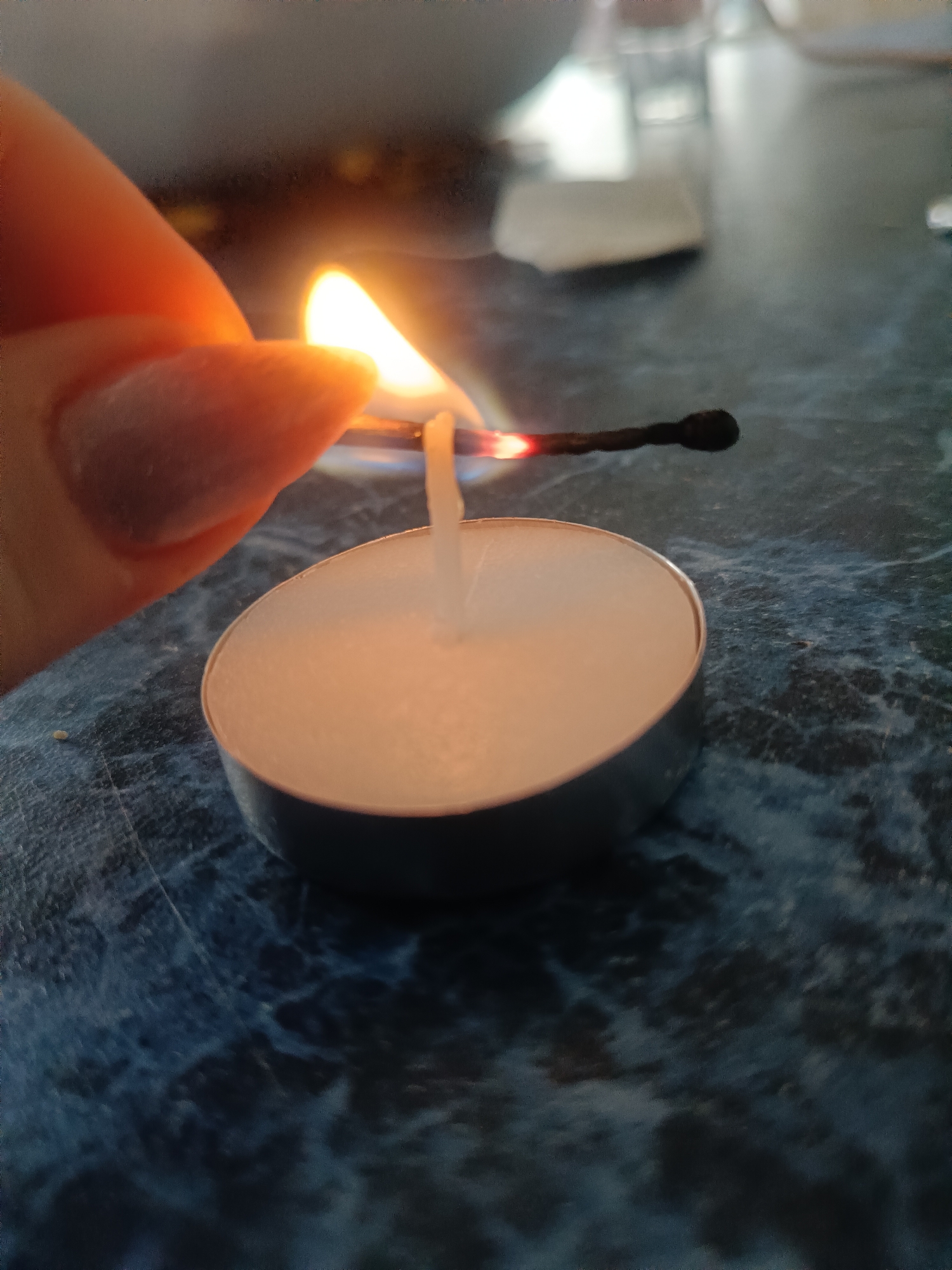 A lit match held in a person's hand ignites the wick of a white tea light candle on a blue marbled surface
