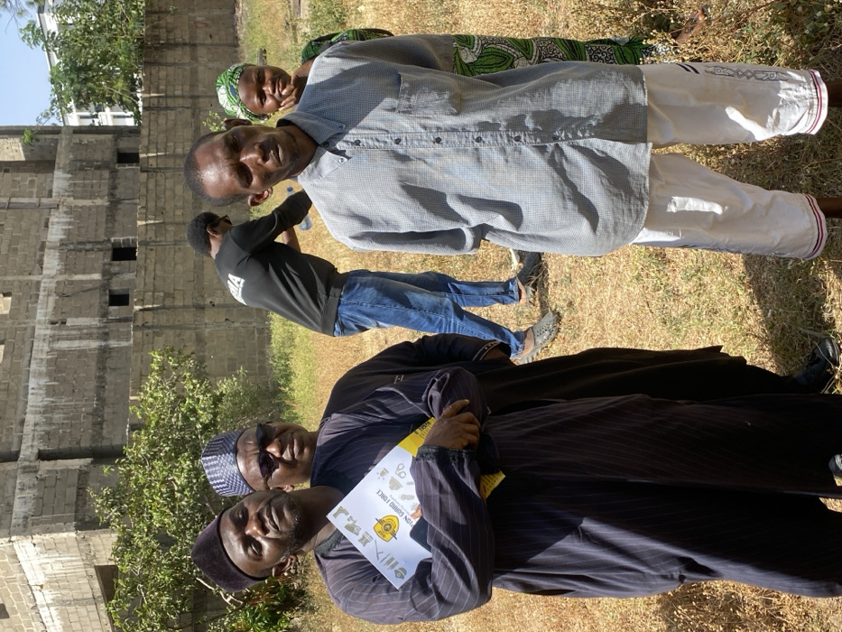 This image depicts an outdoor scene in Unguwar Sarki, Nigeria, featuring five individuals against a backdrop of an unfinished concrete block building