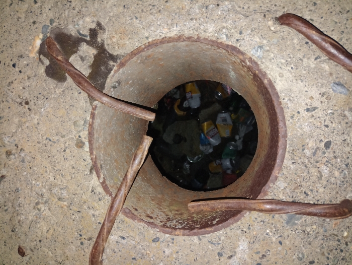 A top-down shot reveals a rusted metal pipe embedded in concrete. Three twisted metal bars extend outwards from the pipe's edge. The pipe's interior is dark and filled with numerous discarded aluminum cans of various colors and brands. The concrete surrounding the pipe appears worn and contains embedded pebbles. A small wet patch is visible near one of the metal bars on the concrete surface.