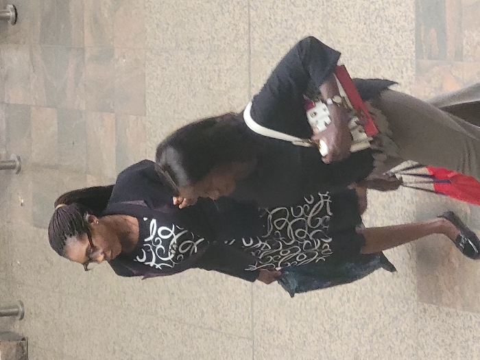Two women stand on a tiled floor. The woman on the left wears glasses, a black shirt with white swirls, and a black jacket. The other woman has long black hair and wears a black jacket with light-colored pants. The woman on the right carries a white purse with a red pattern over her shoulder. Both appear to be looking downward.