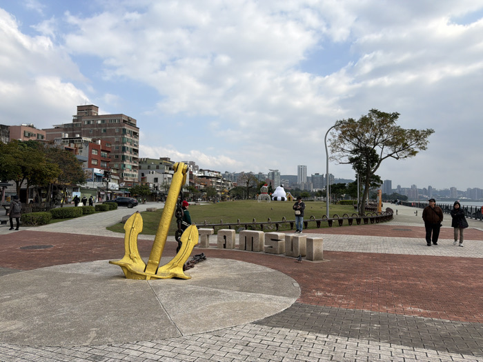 A public space features a large yellow anchor statue in the foreground, resting on a concrete base